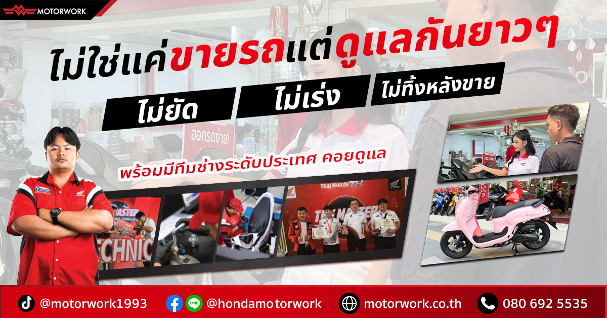 อีกหนึ่งปัจจัยที่ช่วยให้การออกรถ “คุ้มค่า” มากขึ้น คือการมีทีมดูแลที่ต่อเนื่องหลังจากวันรับรถค่ะ ที่มอเตอร์เวิร์ค เราเป็นตัวแทนจำหน่ายอะไหล่ Honda แท้โดยตรง ลูกค้าจึงมั่นใจได้ว่าอะไหล่ที่ใช้เป็นของแท้ มีคุณภาพ และได้มาตรฐานจากผู้ผลิต รวมถึงมีทีมช่างคอยดูแลให้แบบครบในที่เดียว ไม่ว่าจะเป็นการเช็กระยะ การดูแลทั่วไป หรือคำแนะนำเล็ก ๆ น้อย ๆ ระหว่างการใช้งาน ซึ่งช่วยให้คุณใช้รถได้อย่างสบายใจมากขึ้นในระยะยาวค่ะ